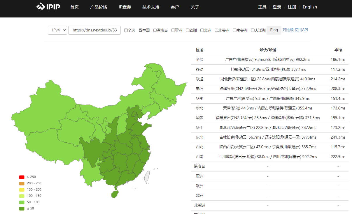 通过ping工具测试发现,目前大陆提供解析的是香港的两家服务器,misaka.io和anexia.com,而且服务各占一半。ipip.net的测试看反馈数据较好。