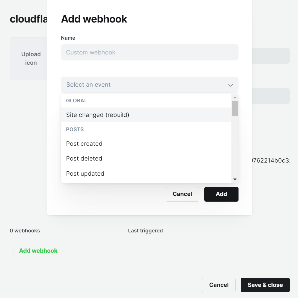 在Ghost后台的Integrations新建一个项目,取个名字,然后点击Add webhook。