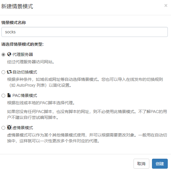 新建情景模式选择代理服务器,然后创建: